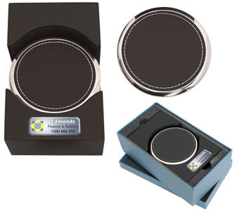 This set of 4 genuine leather coasters is presented in a wooden stand. Supplied in stylish gift box.