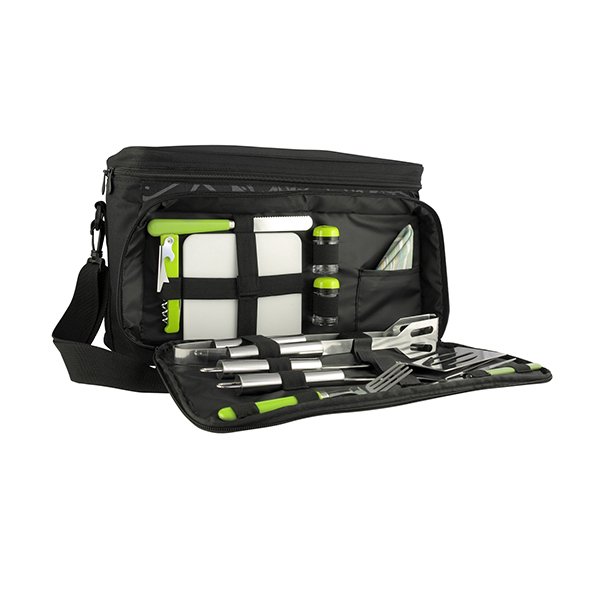 BBQ Picnic Bag features a zippered compartment that includes a 3 piece BBQ set including a fork, tongs, spatula, along with a cheeseboard, cutting knife, salt and pepper shakers, knife and fork, waiters tool and towel. Main compartment is a large cooler b