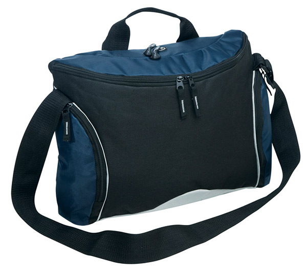 600D/420D polyester. Right side zippered pocket contains an organiser. Left side zippered pocket contains a mesh mobile phone pouch. Double zippered main compartment contains CD/MP3/Ipod pouch. Rubber eyelet for earphones. Webbing carry handle. Adjustable webbing shoulder strap. Business card holder on back.