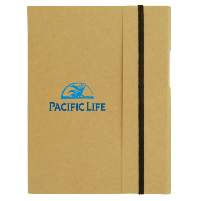 A larger version of our HT934 Tuck Journal. The Tuck Journal notebooks come with a heavy fl exible paper cover made from recycled paper and have 85 pages of recycled lined paper. Other features include a blank black ink pen made from recycled paper and an elastic band to keep the notebook closed. The inside cover and each page have the recycled logo in the corner. Available in blue or tan.