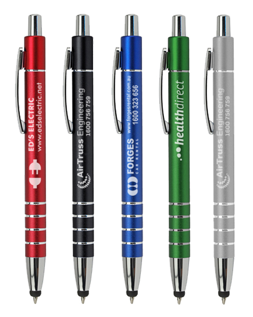 Aluminum Stylish design pen with Shinny Silver Fittings in a Range of 5 Colors and ipad Screen Touch End Tip, Click Action with Plastic Parker-Type ink Refill.