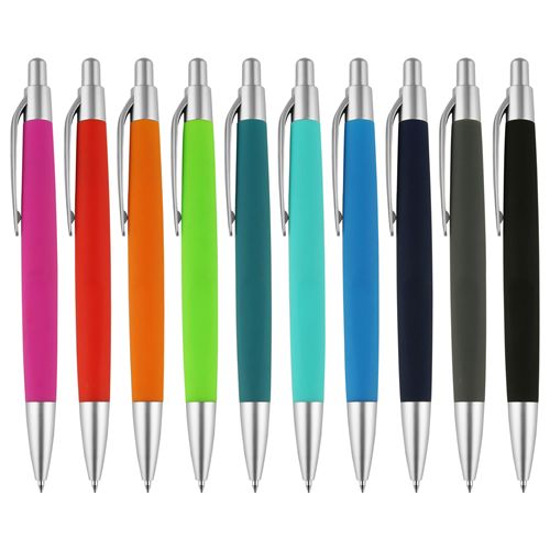 One of the most popular promotional pens with soft-touch rubberized barrel and satin chrome accents, it brings a beautiful contrast to the vibrant barrel colour. The large colour selection offers a great choice for your corporate colours. Click action, high quality cross-type refill with German manufactured black ink and tungsten carbide ball which brings you the better writing quality, 1200 metres writing distance. Item Size: 140 mm x 13 mm x 11 mm Color Range: black, grey, navy blue, royal blue, teal, light blue, green, red, pink, orange.